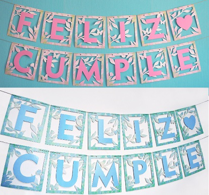 BANDERIN FELIZ CUMPLE CALADO CELESTE / ROSA MARCA:
