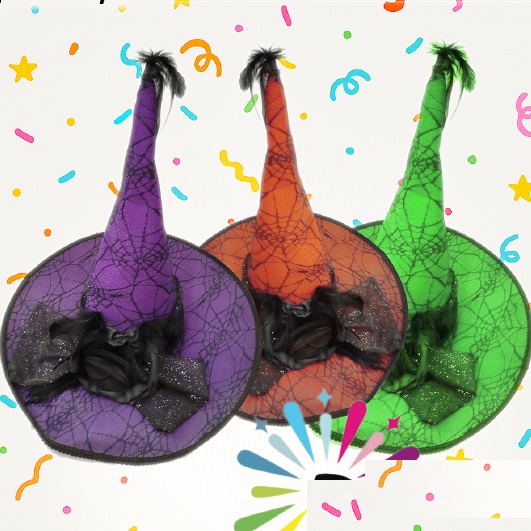 GORRO BRUJA GRANDE COLOR CON TUL ROSA Y PLUMAS